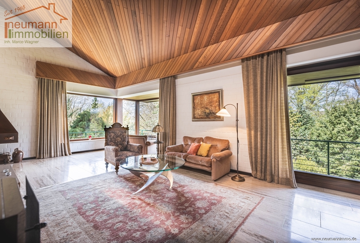 Im Inneren des Hauses begeistert besonders der Wohnbereich im Erdgeschoss. Die markant hohe Holzdecke und großzügige Panorama-Glasfronten lassen Innen- und Außenraum ineinander übergehen und öffnen eine spektakuläre Aussicht auf den Garten.