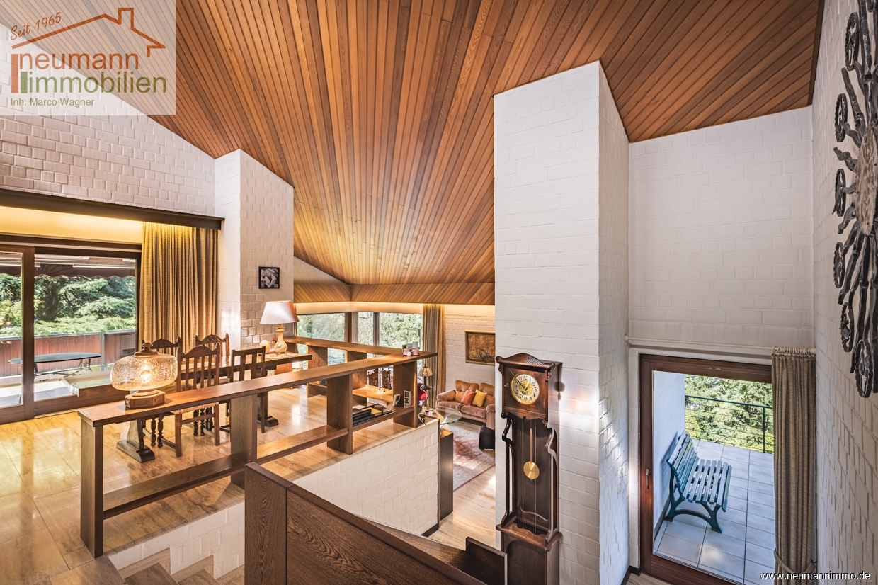 Außerdem sorgt die Split-Level-/Galeriegestaltung dafür, dass der Raum besonders weitläufig und sehr wohnlich wirkt. Der offene Kamin ist das stimmungsvolle Zentrum, ideal für entspannte Abende.