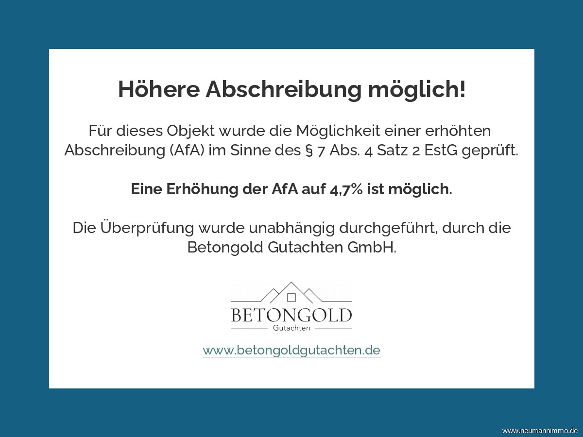 Für Kapitalanleger ist eine erhöhte Abschreibung von rund 4,76 % p.a. auf das Haus möglich (Vorabprüfung durch unseren Partner Betongold), was die Investition zusätzlich attraktiv macht.